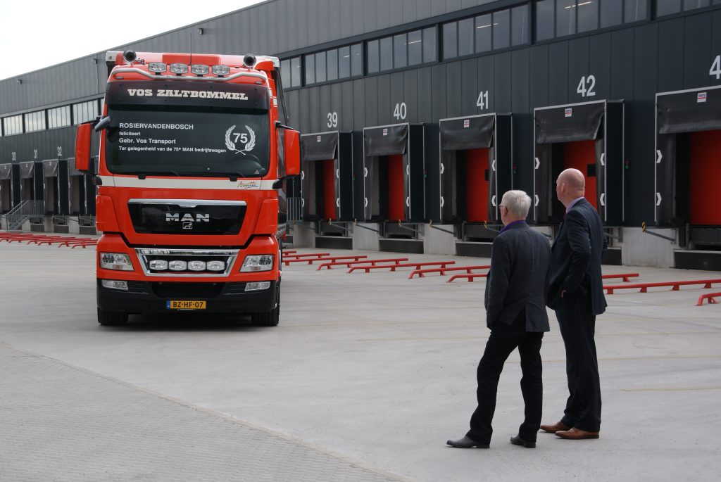 Tijdens de opening van het nieuwe pand werd ook de 75e MAN truck aan Vos geleverd door truckdealer Erik Rosier van den Bosch.